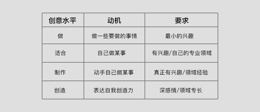 我們來看一個科學家桑德斯關于對消費水平的研究,從典型的購物體驗中得到的所有東西,可以將它們分為:購物,購買,擁有和使用四個層次,而且,這四種層次的創造力,都是每天人類所需要的我們用一個表來闡述一下: